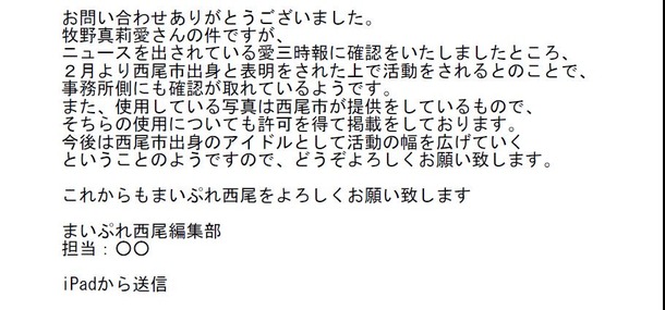 牧野真莉愛、西尾市公表問題に決着!UFAから正式に発表「2月より西尾市出身を表明してアイドル活動の幅を広げて行く」
