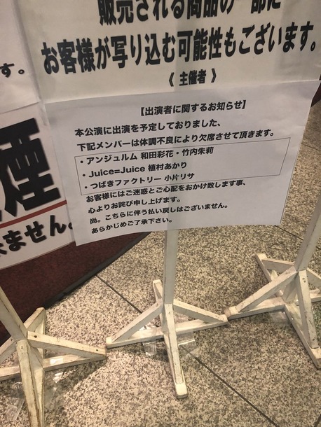 入場したらあやちょ、タケちゃん、あーりー、りさまるが体調不良で2部出ないって張り紙あった!