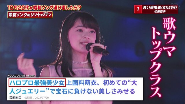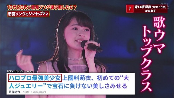 日本テレビ音楽特番「歌のシン・トップテン」から、放送内で披露された昭和ポップスのリアレンジ楽曲から、ハロー!プロジェクトのアイドルグループ「アンジュルム」に所属し、屈指の歌唱力を誇る上國料萌衣が歌う「青い珊瑚礁」カバーをミュージックビデオ化!